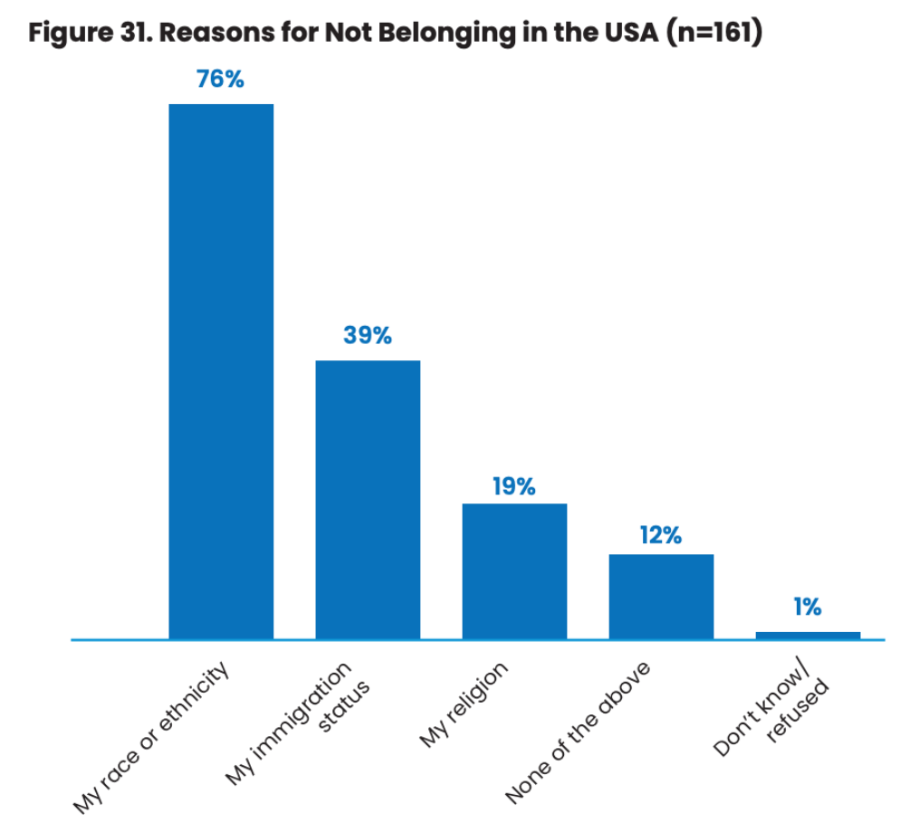 Although Asian Americans are the fastest-growing ethnoracial group with high education and income levels, many still face racism, exclusion, and a conditional or limited sense of belonging. Only 39% strongly agree they feel they belong in the U.S. (Figure 29), revealing a tension between outward success and internal experiences of discrimination and exclusion (Figures 31 and 32).