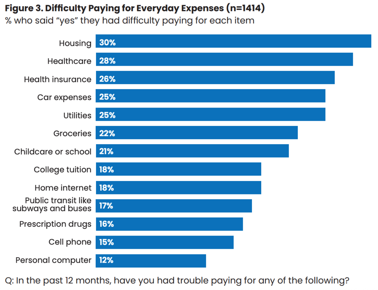 While 27% of all respondents cited housing as the most pressing issue in Massachusetts (Figure 1), an even greater proportion (30%) reported personally struggling to afford housing (Figure 3)—indicating that this issue is not just perceived but directly experienced across the state.