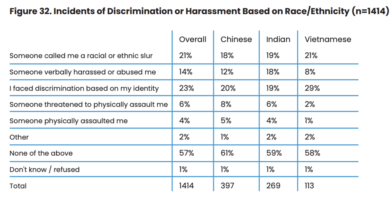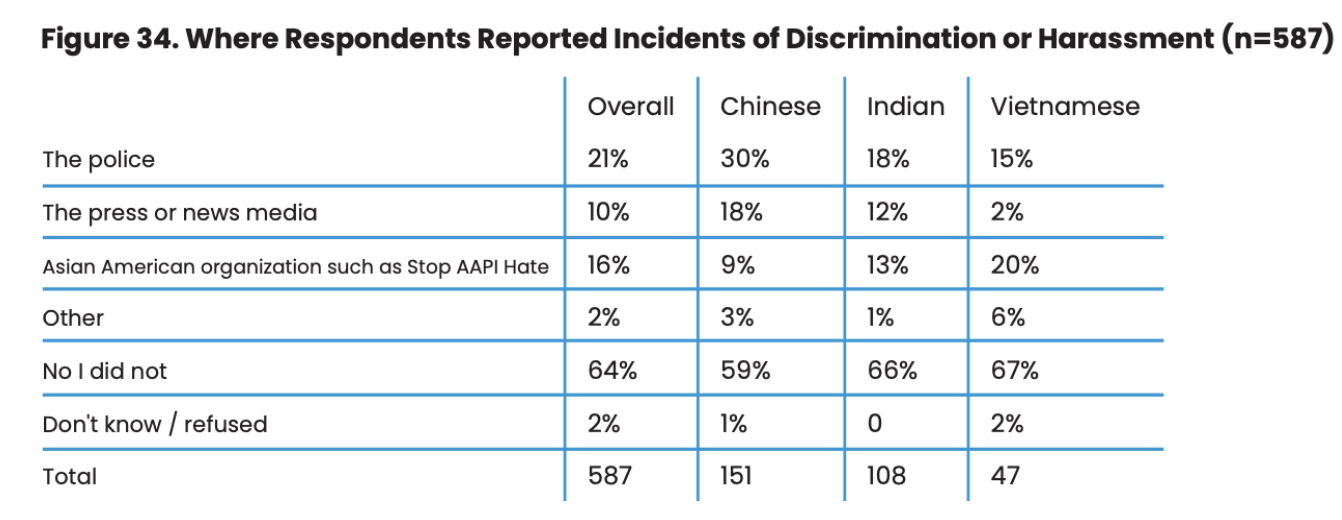 Nearly a quarter of respondents (23%) experienced discrimination, 21% faced racial or ethnic slurs, and 14% experienced verbal harassment in the past year. However, 64% of those experiencing discrimination did not report it to any authority or organization, largely due to fear of retaliation or unwanted attention (Figure 34).