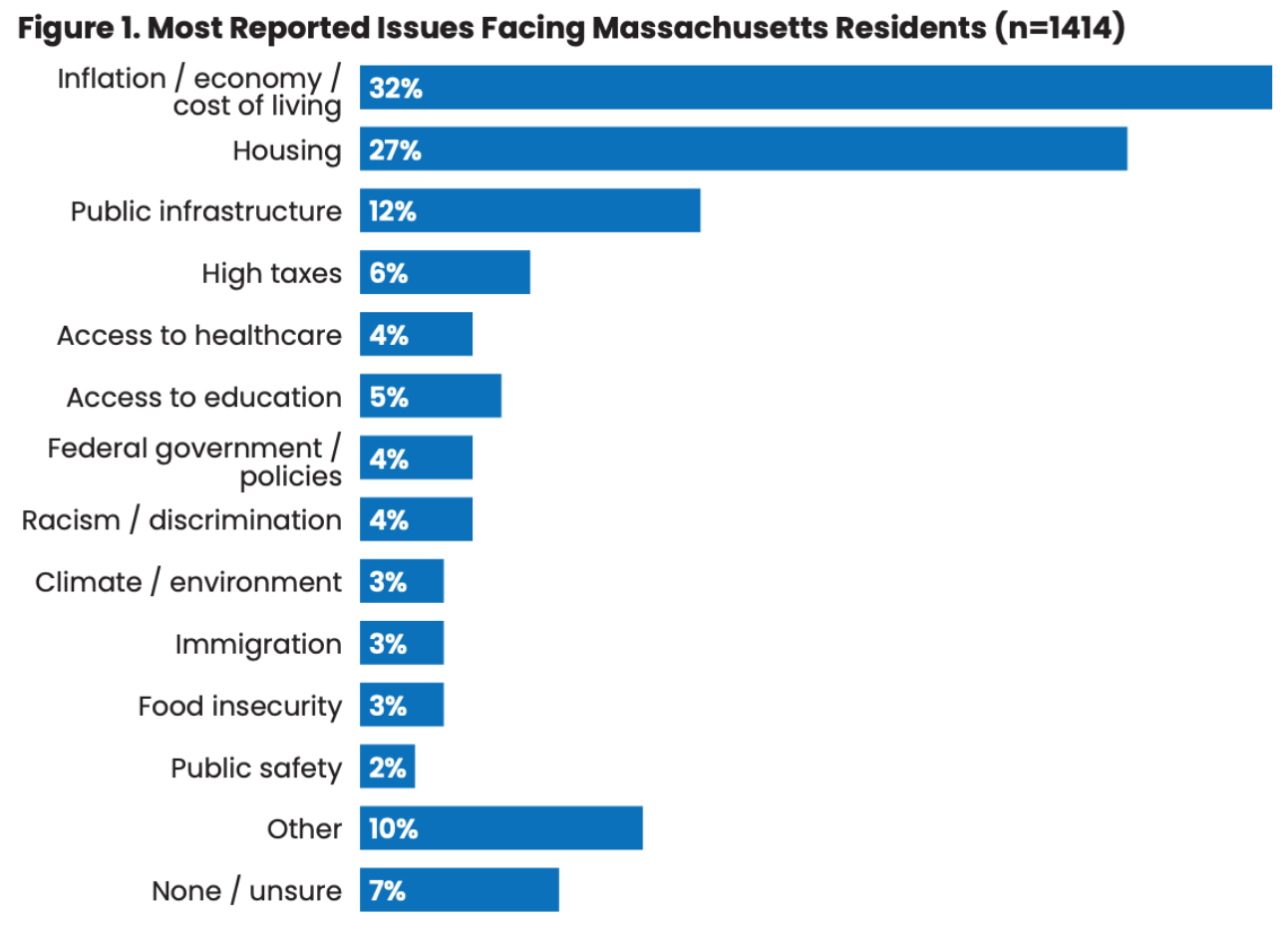 Roughly one-third (32%) of all respondents identified inflation, the economy, or cost of living as a top issue in Massachusetts (Figure 1)—this concern was consistent across gender, ethnicity, and most age groups, demonstrating its widespread impact.