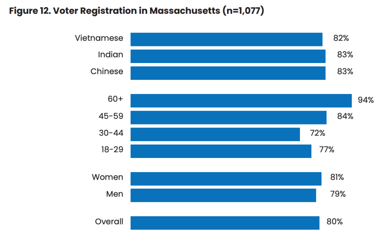 Despite facing structural barriers, 80% of APIA survey respondents reported being registered to vote in Massachusetts, and among them, 84% said they voted in the 2024 Presidential Election. Registration and turnout increased significantly with age—94% of respondents aged 60+ were registered, and 92% of them reported voting.